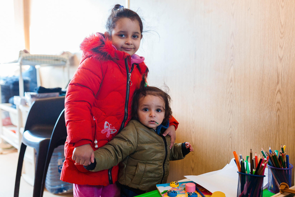 ウクライナとモルドバのパランカ国境にある、ユニセフが設置したブルードットの「子どもにやさしい空間」で遊ぶウクライナ難民の4歳のエスメラルダちゃんと1歳のサイドちゃん。(モルドバ、2022年3月19日撮影)