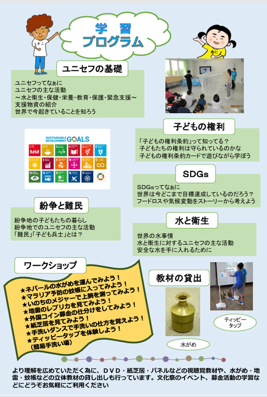 支援が必要な世界の子どもたちの現状やユニセフの活動について学習する機会を広げるために、以下の活動を行っています。